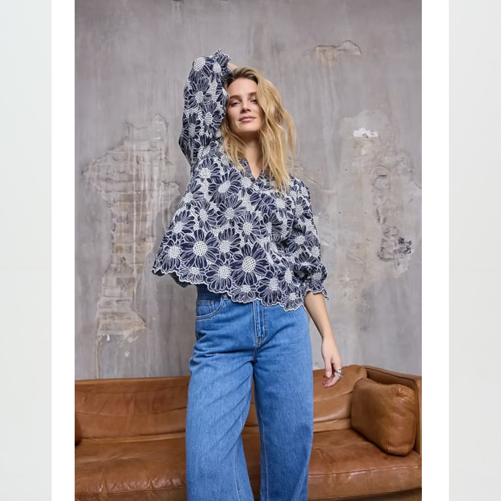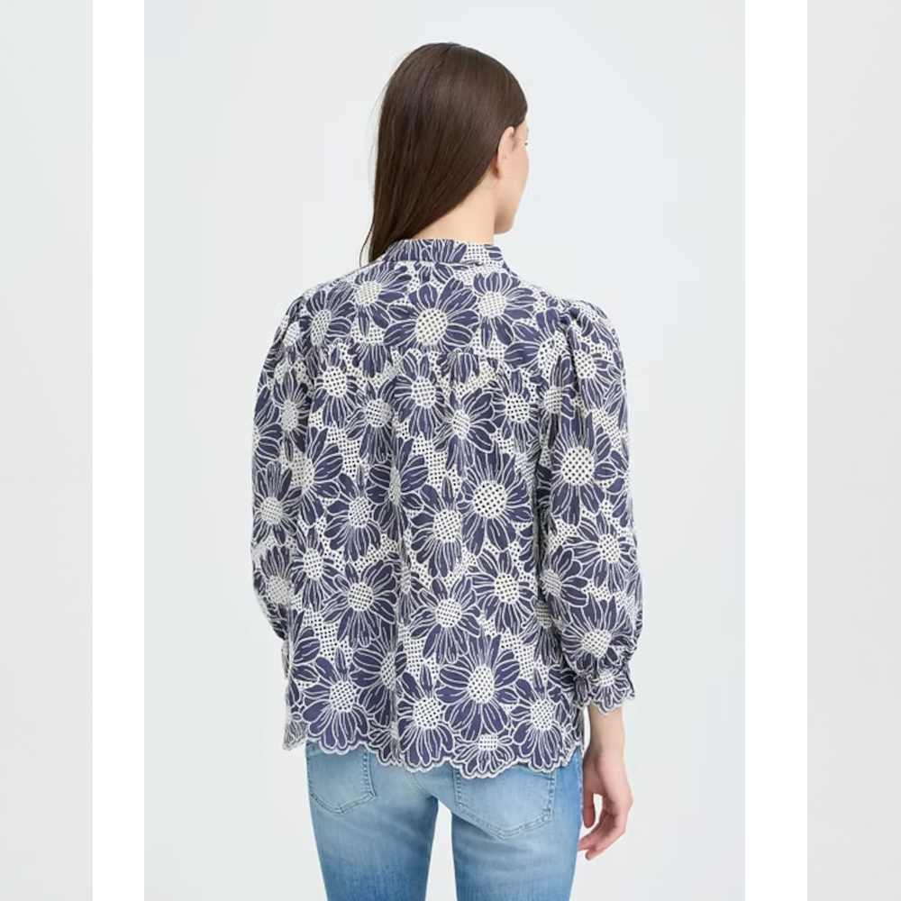 Premium woven cotton navy blouse with  an exquisite white floral design