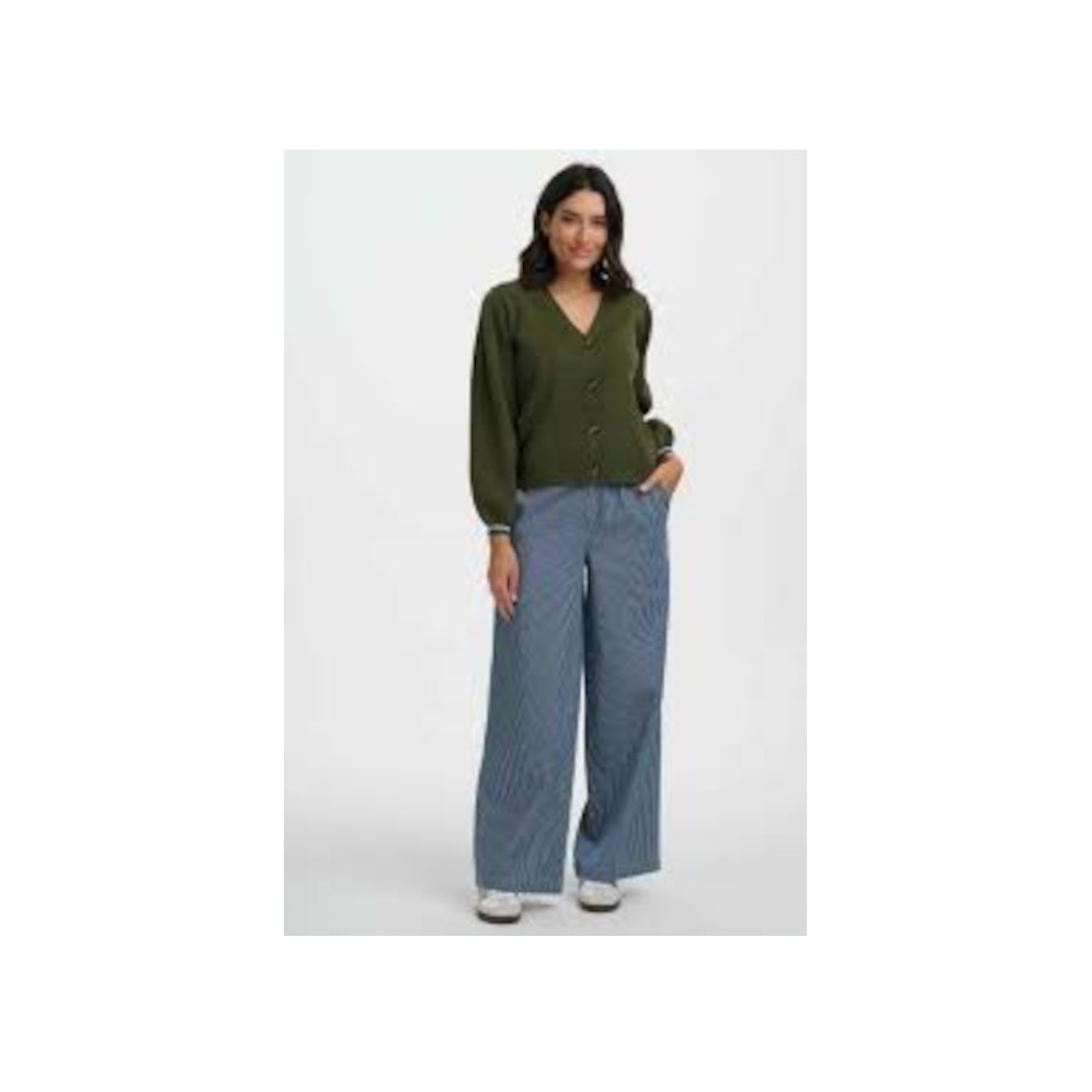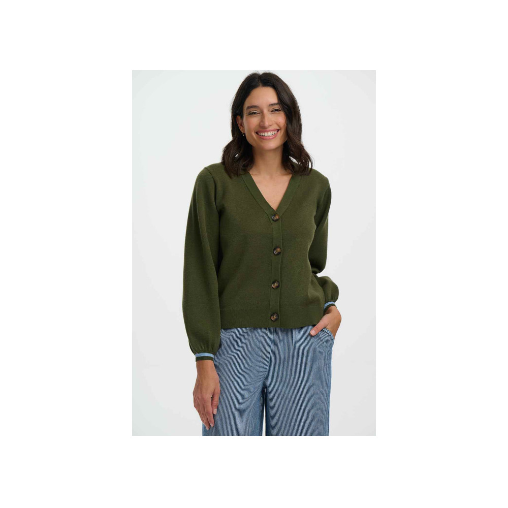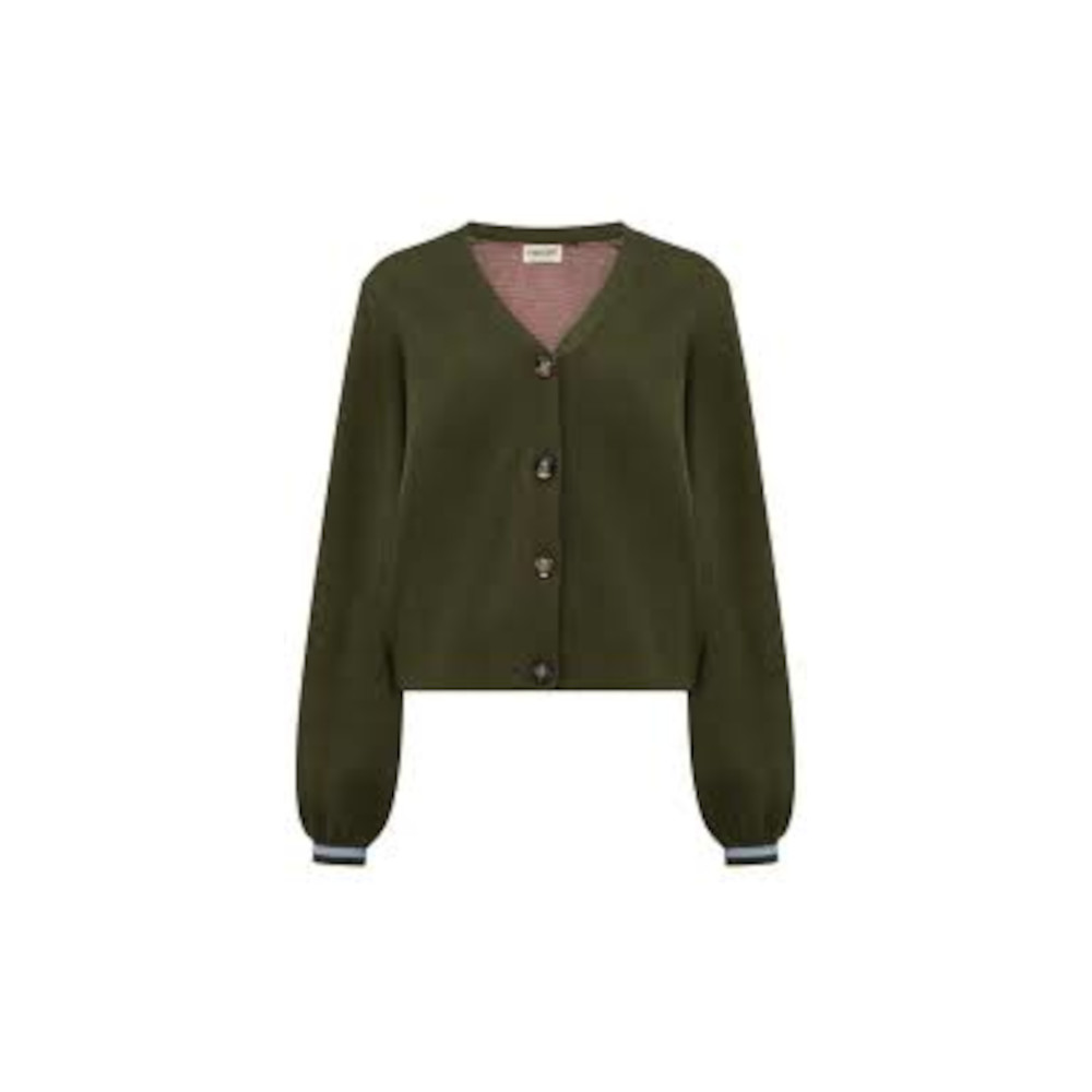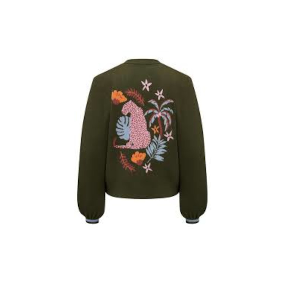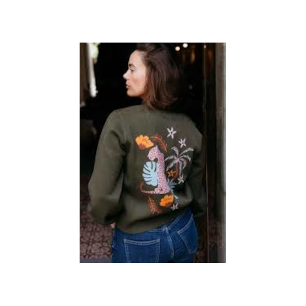 Adrian Cardigan in khaki with a leopard and jungle motif from Sugarhill Brighton
