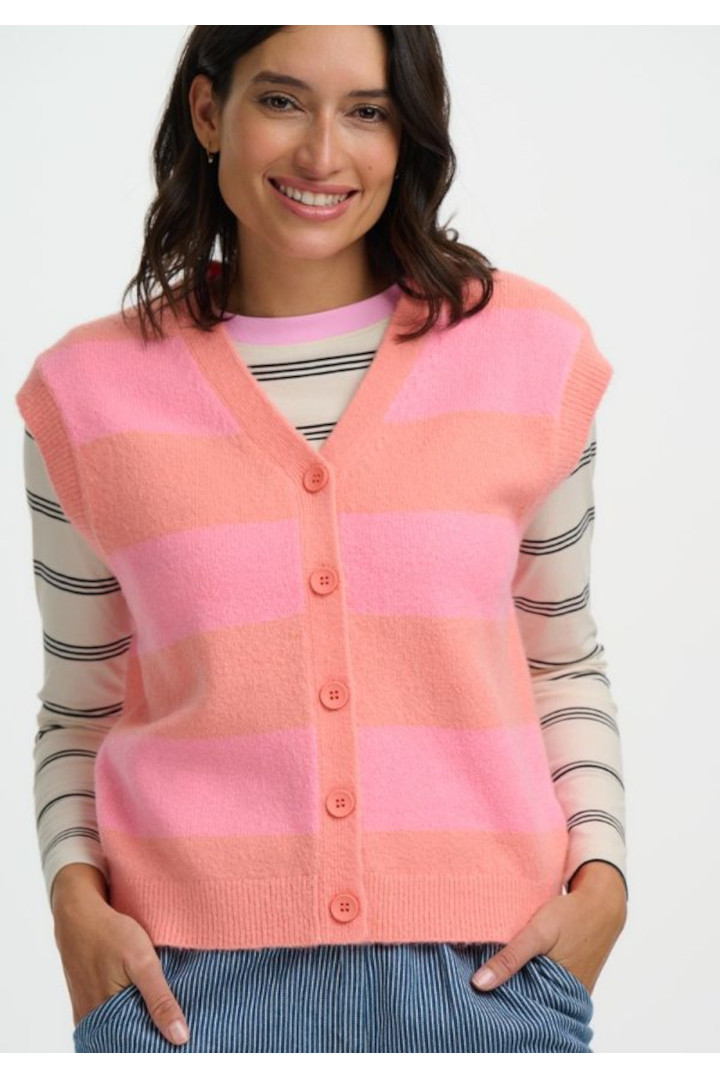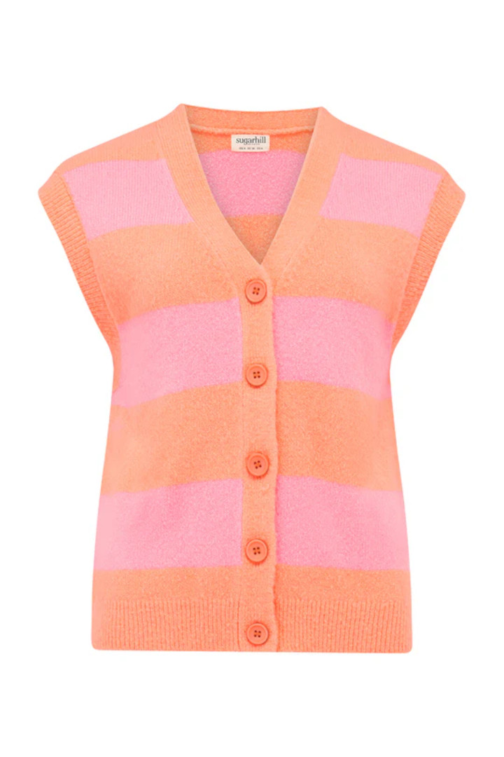 Peach stripped knitted V- neck vest from Sugarhill Brighton with pink button detailing.