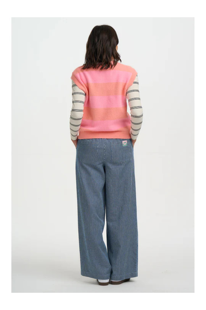The Amber Knit Vest from Sugarhill Brighton is a playful layering piece that adds instant colour to everyday outfits. Featuring soft horizontal stripes in warm pink and peach tones, this sleeveless knit vest has a flattering V-neckline and button-through front for easy styling. Perfect layered over a tee or shirt, it brings a cosy, retro-inspired feel to casual looks while staying light enough for year-round wear.