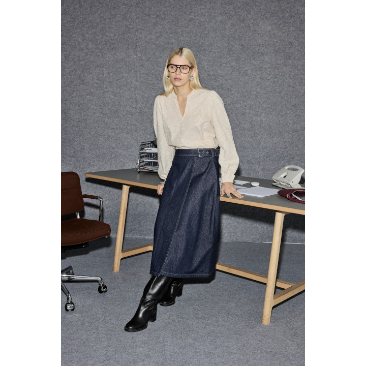 Mid-length skirt in indigo-coloured denim. A-line cut, wrap-over style with integrated belt