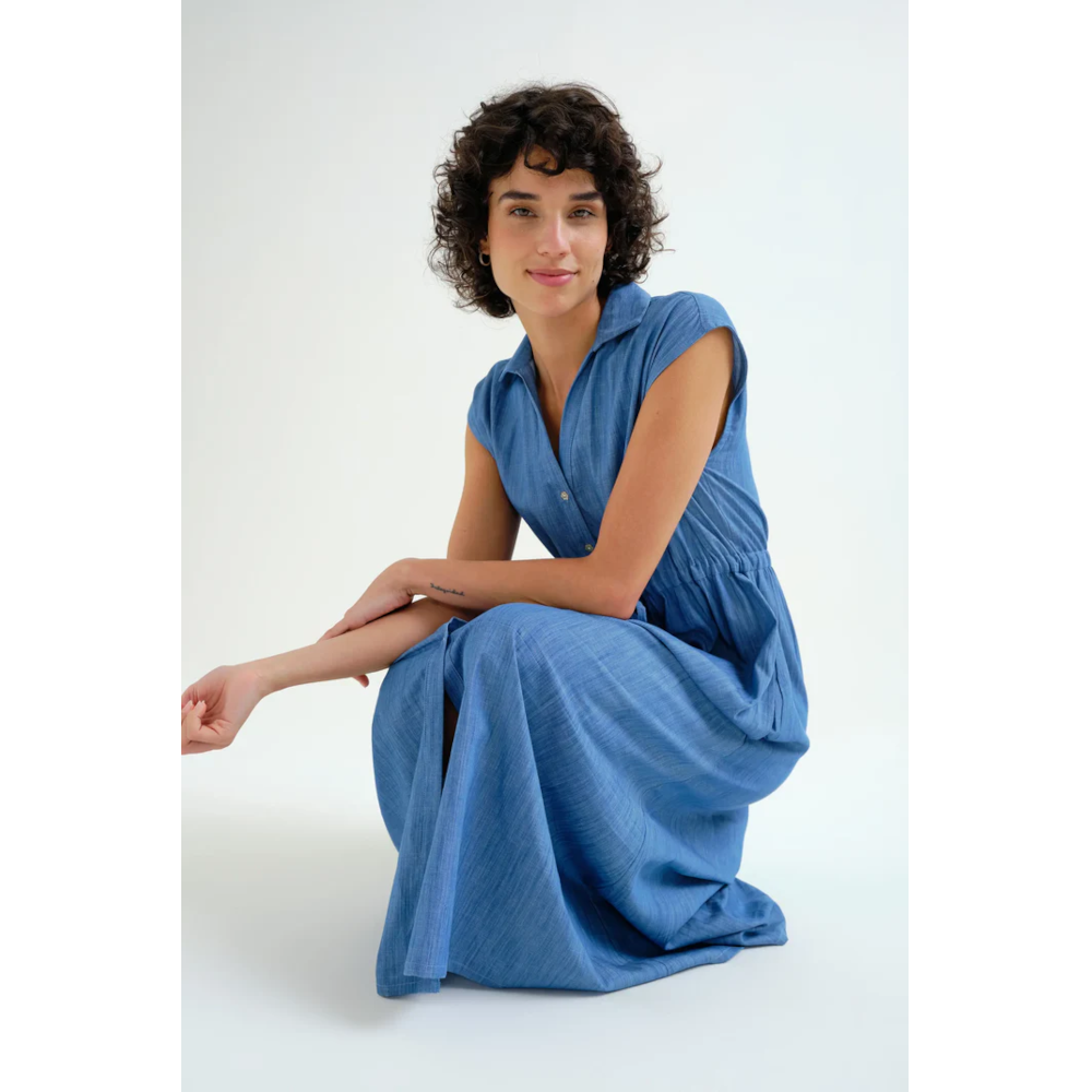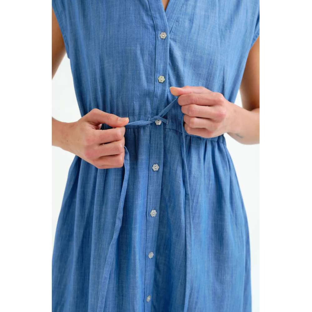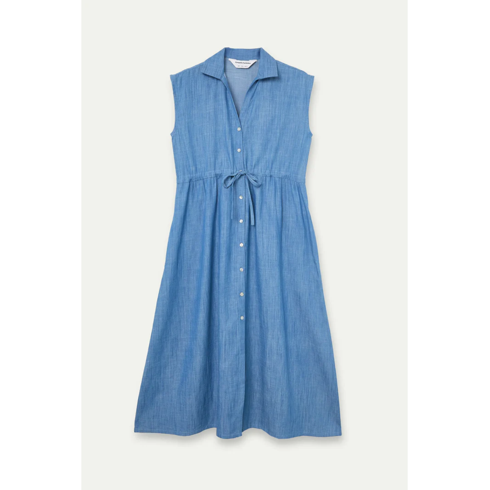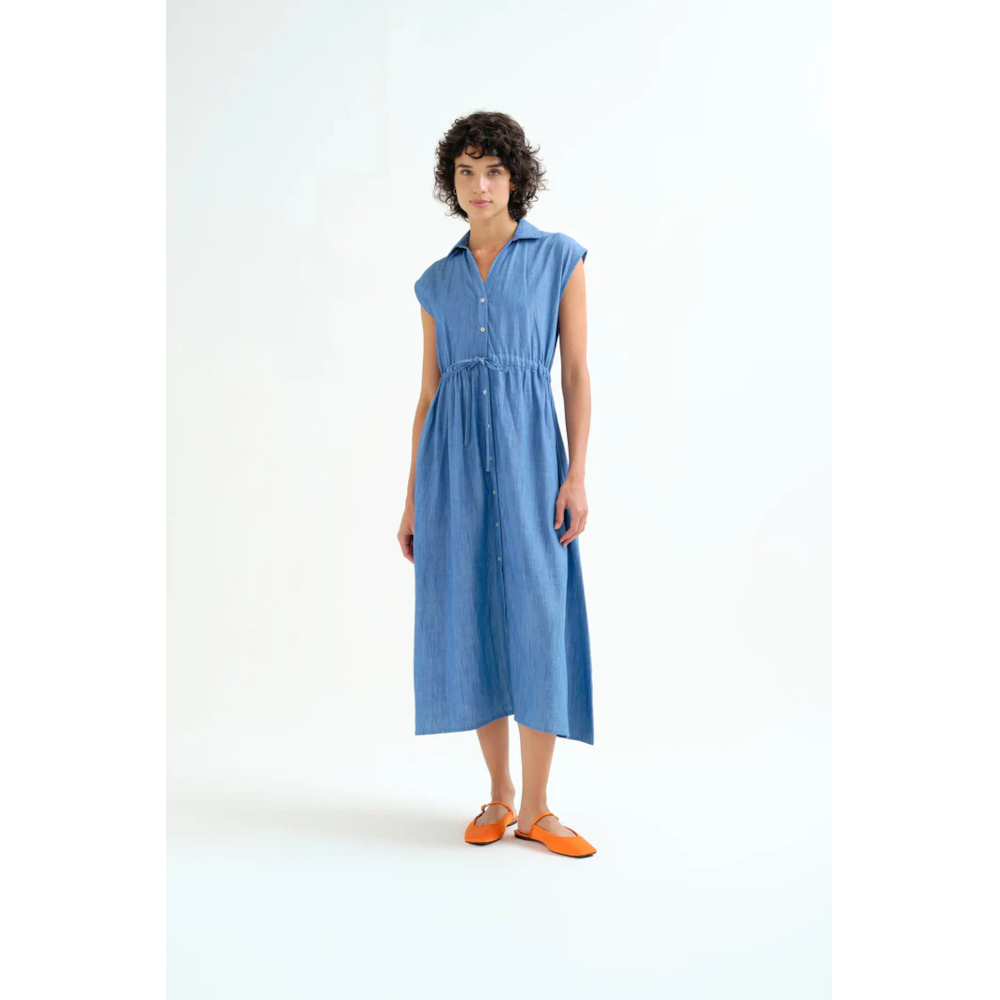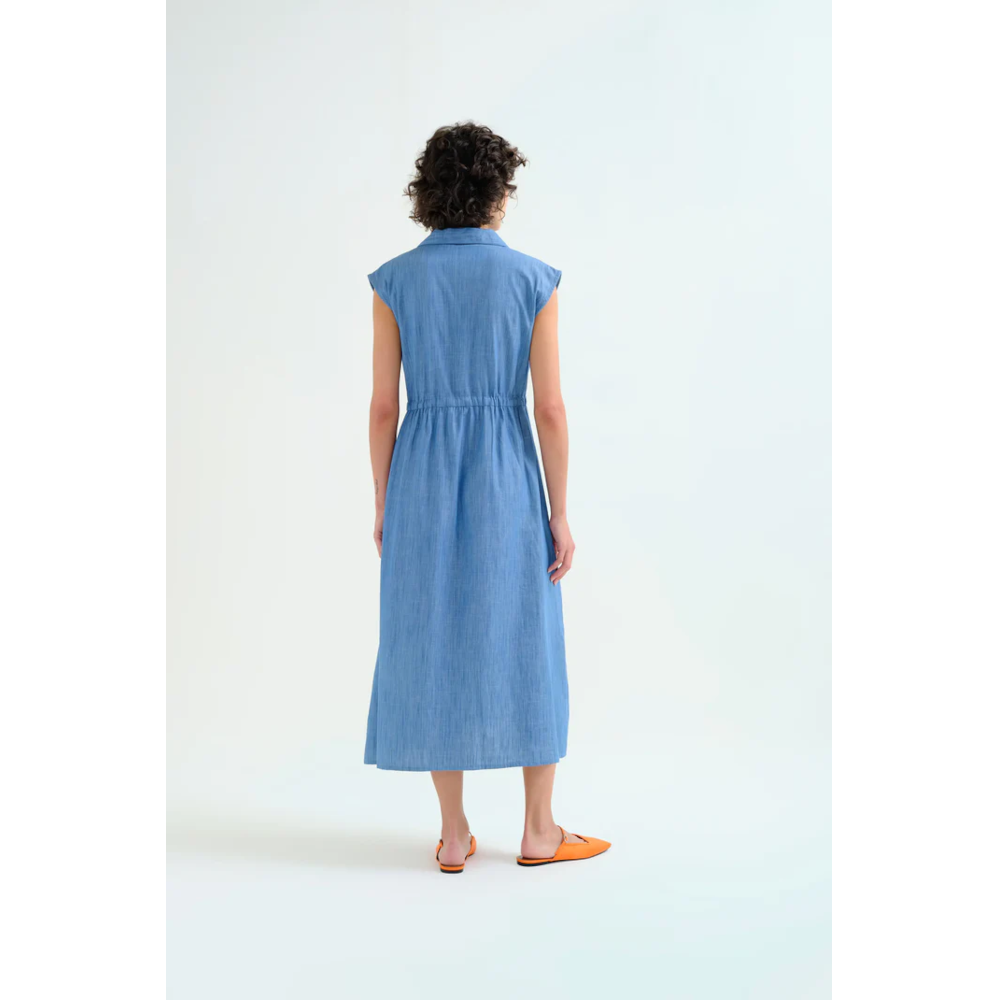 Light blue midi dress in 100% cotton chambray. Features a lapel collar and is sleeveless. Front button closure with white flower-shaped buttons. Adjustable drawstring waist.