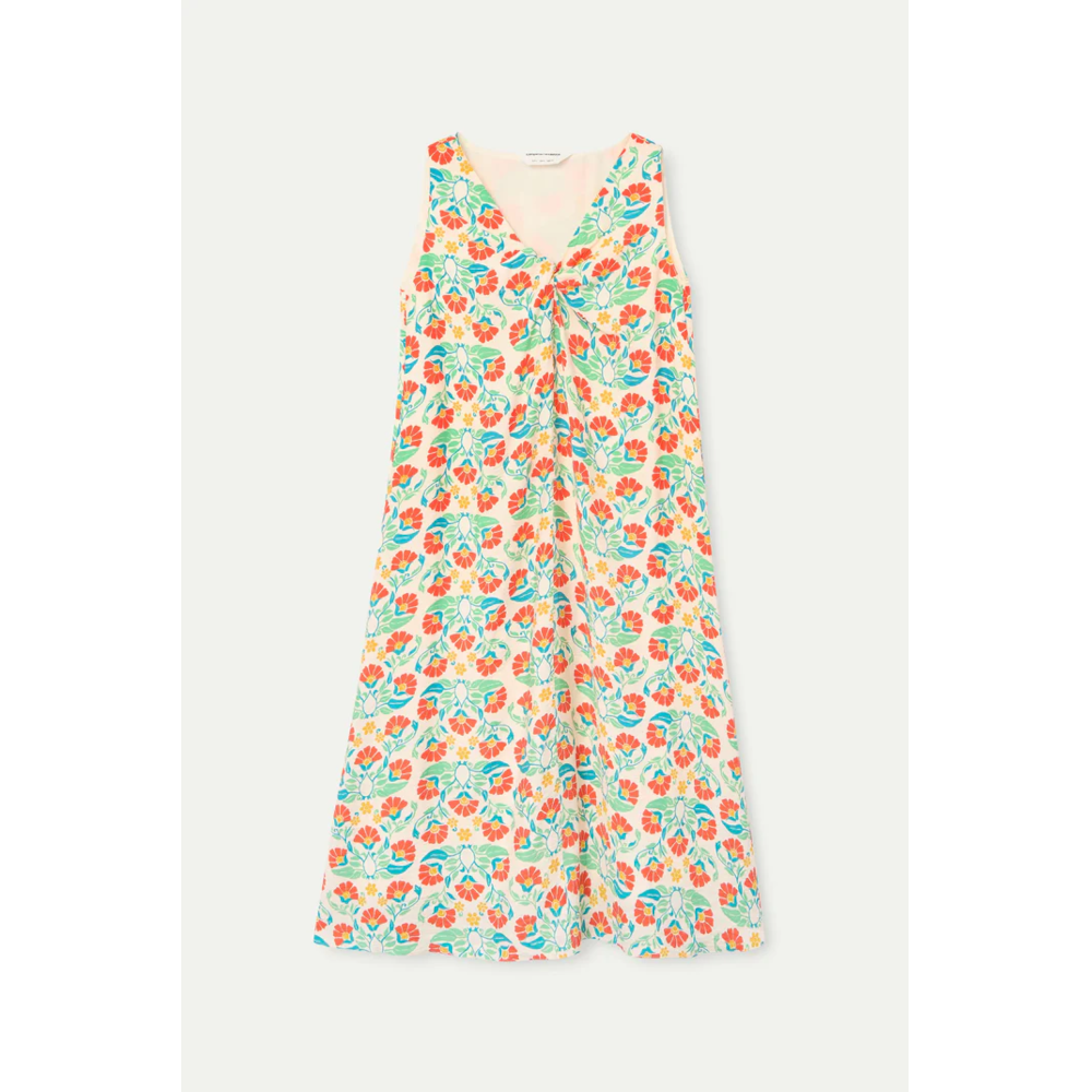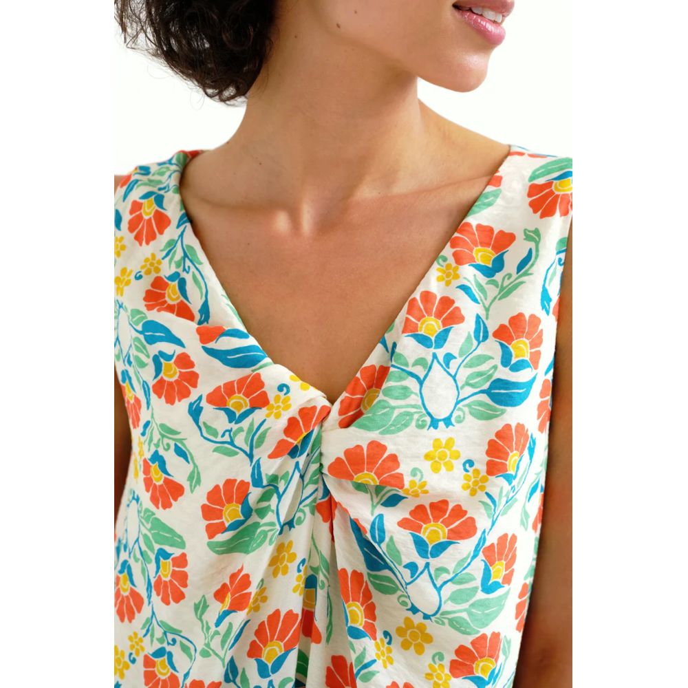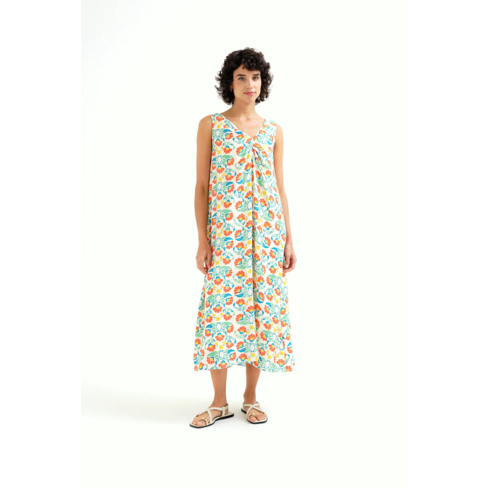 Crepe midi dress with a small royal print. V-neck with a knot twist feature. Sleeveless dress with a flowy fit. The dress is fully lined but is light and cool on even the hottest days!
