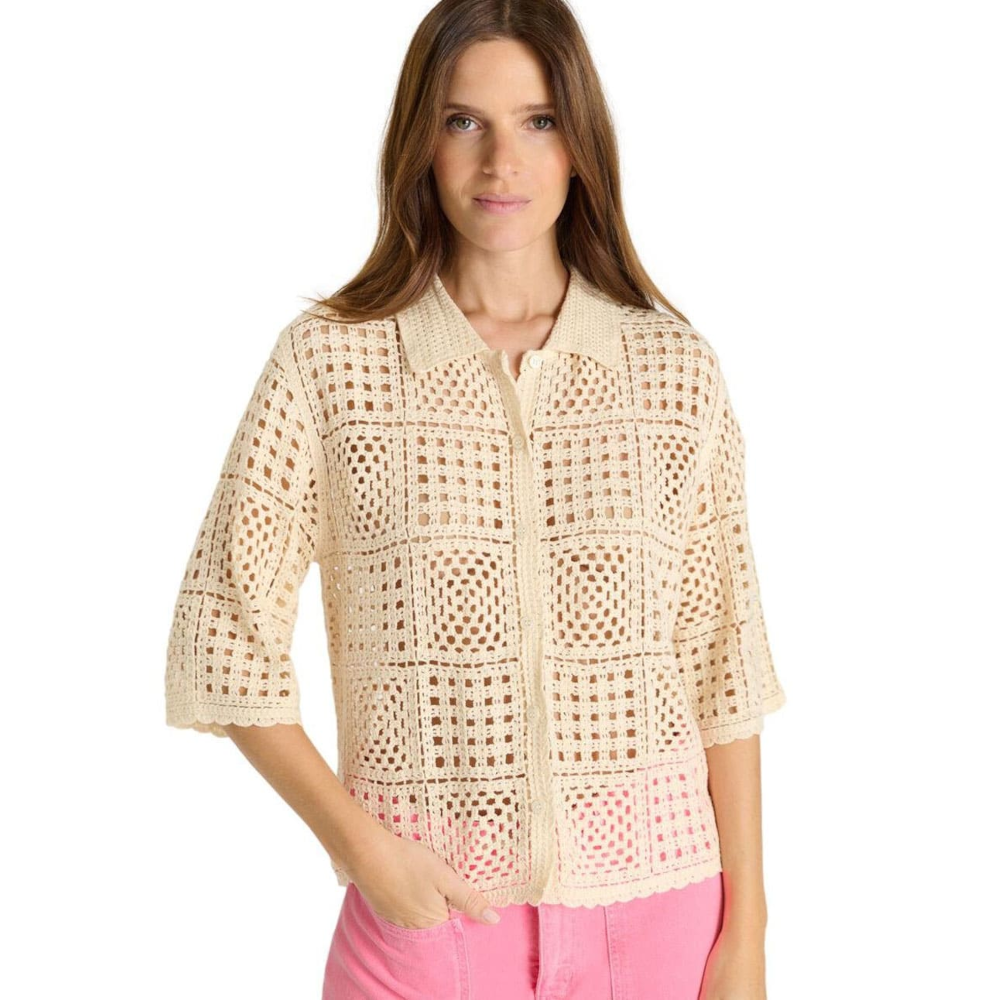The Le Temps des Cerises Elmar Beige crochet style short sleeve cardigan brings elegant style and comfort to any season. With its versatile design and pleasant fabric, it’s ideal for urban looks or more sophisticated outfits. Its flattering cut makes it easy to combine with other pieces, completing a modern and practical everyday wardrobe. A very versatile item that be styled in a number of ways, with jeans, trousers, with a skirt over a dress, opened or closed, with a top underneath, a very handy item!