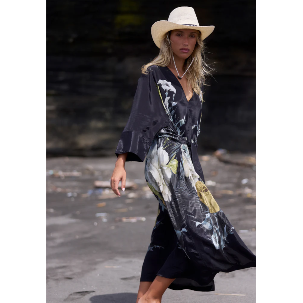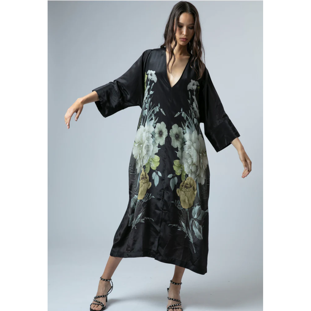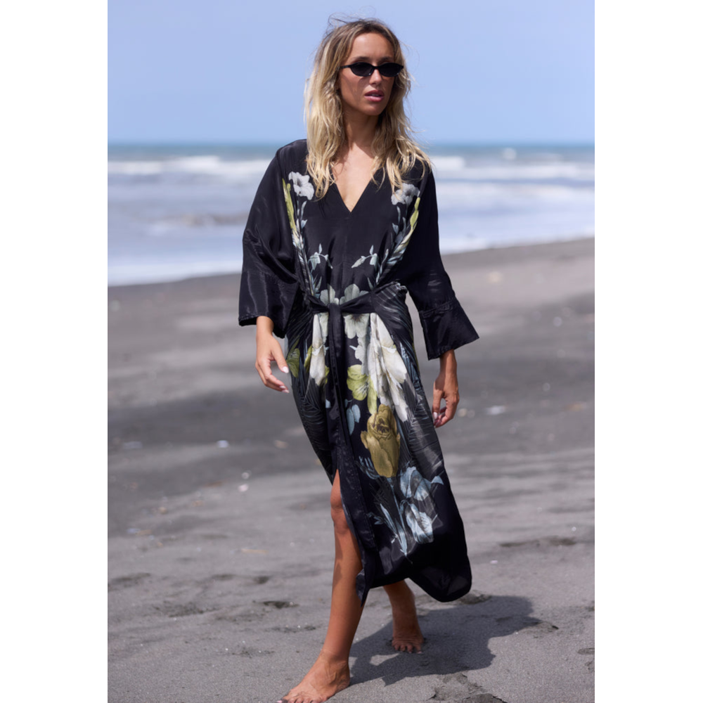 Flowing and effortlessly chic, the Fiona Tunic is an oversized kaftan crafted from luxurious silk-like fabric. Featuring a flattering V-neck and long sleeves, this midi-length modesty piece is designed with waist ties for a customizable, more fitted silhouette. Adorned with our striking large Camellia floral placement print in yellow on a black base, it embodies refined elegance. Perfect for special occasions or elevated everyday wear. The model wears a size UK 10. Length from the top: 127 cm. Dry clean only.