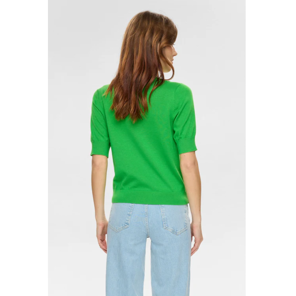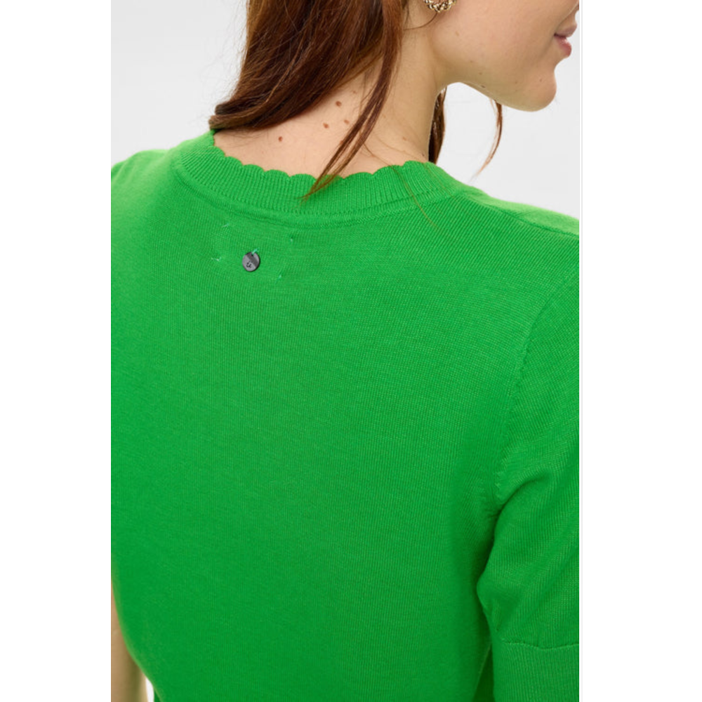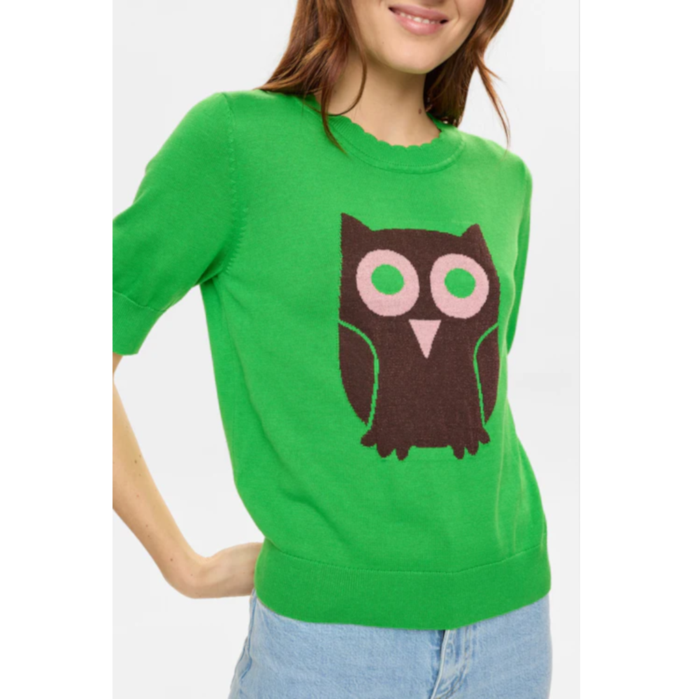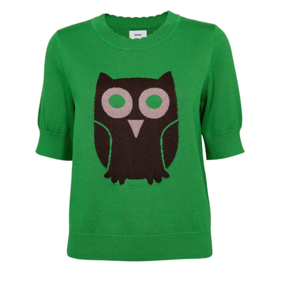 The Nümph glimma Pullover is a fine-knit sweater with personality. It features short sleeves, an owl print on the chest, and comes in a cool and versatile classic green. Perfect for transitional weather with a relaxed style.