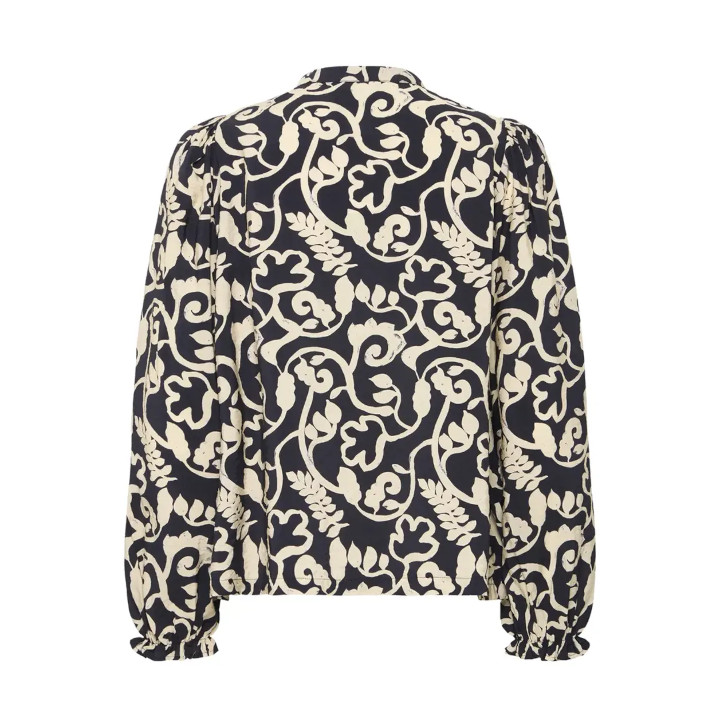 Navy blouse with off white abstract flower print. features a grandad collar and a ladder stitch detail and an elasticated cuff