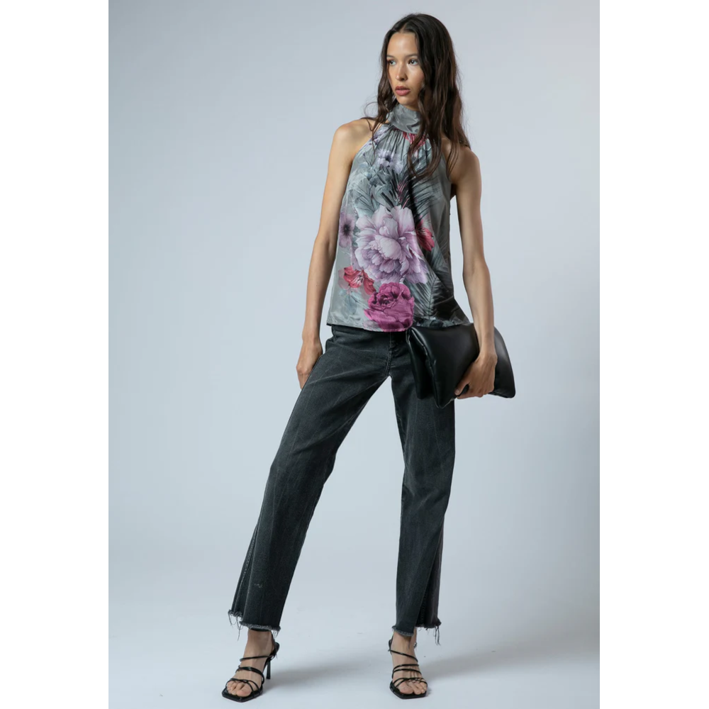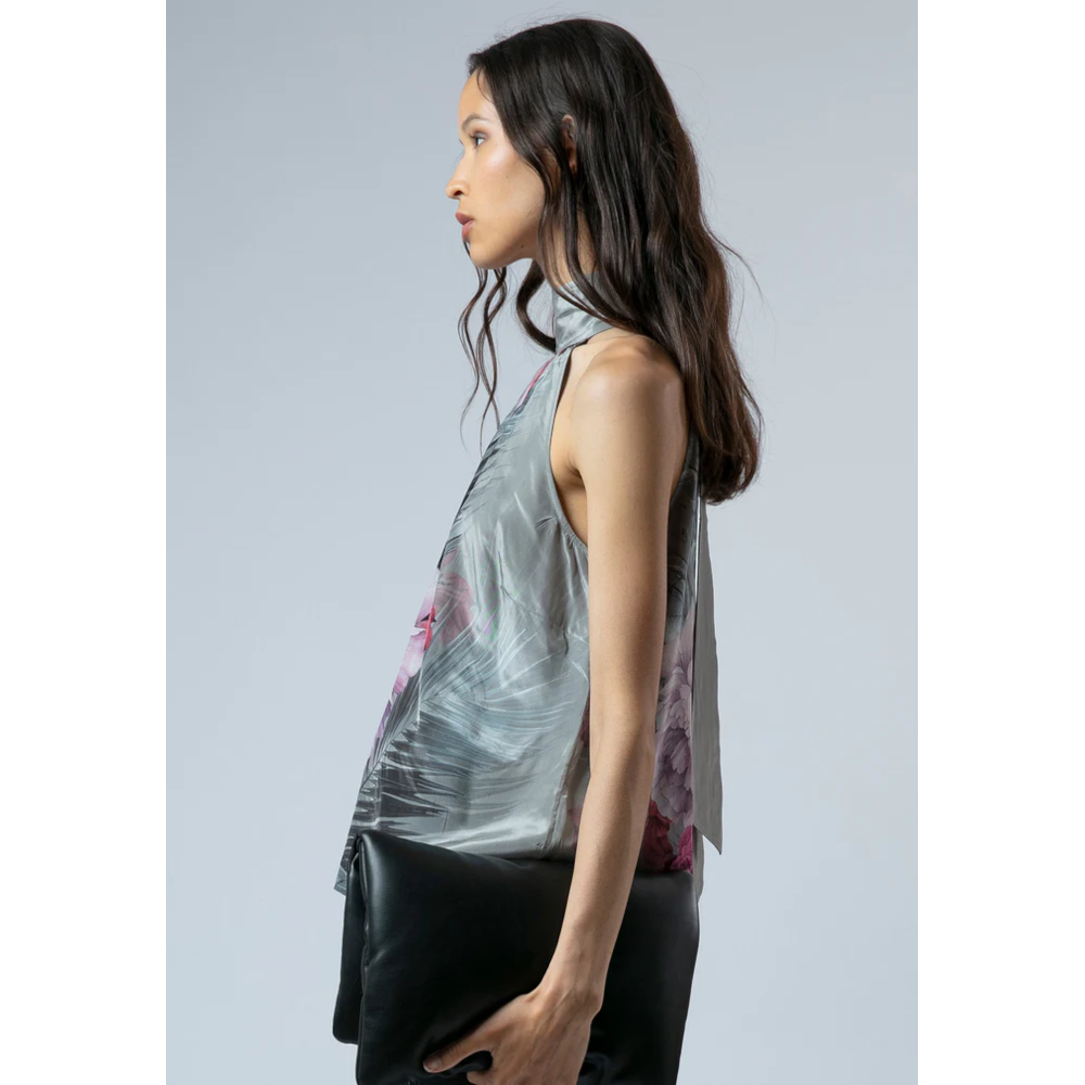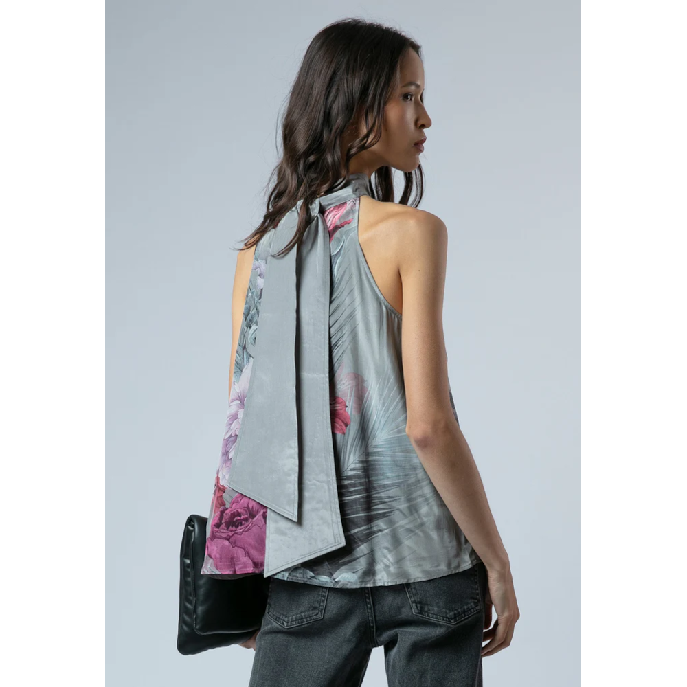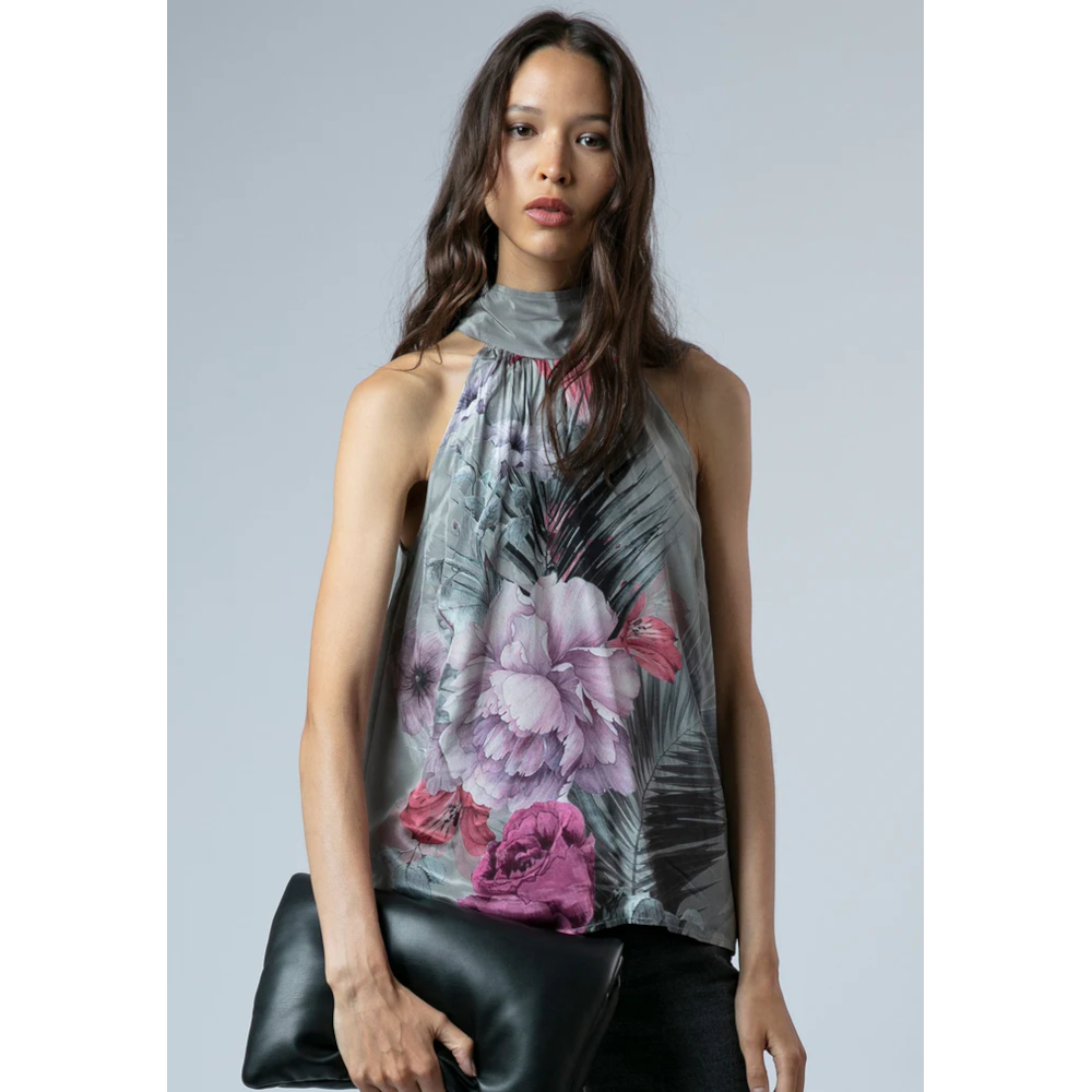 Light and elegant, the Lauren Halter neck Top is crafted from a smooth silk-like fabric in a relaxed, sleeveless silhouette. Falling to hip length, it features a flattering halter neck neckline and showcases our striking large floral Camellia placement print in pink and taupe. Effortlessly transitioning from desk to dinner, this easy-fit top adds a touch of refined style to any wardrobe. The model wears a size UK 10. Length from the top: 62 cm. This is dry clean only