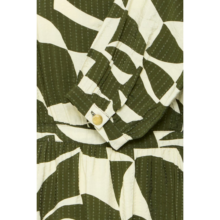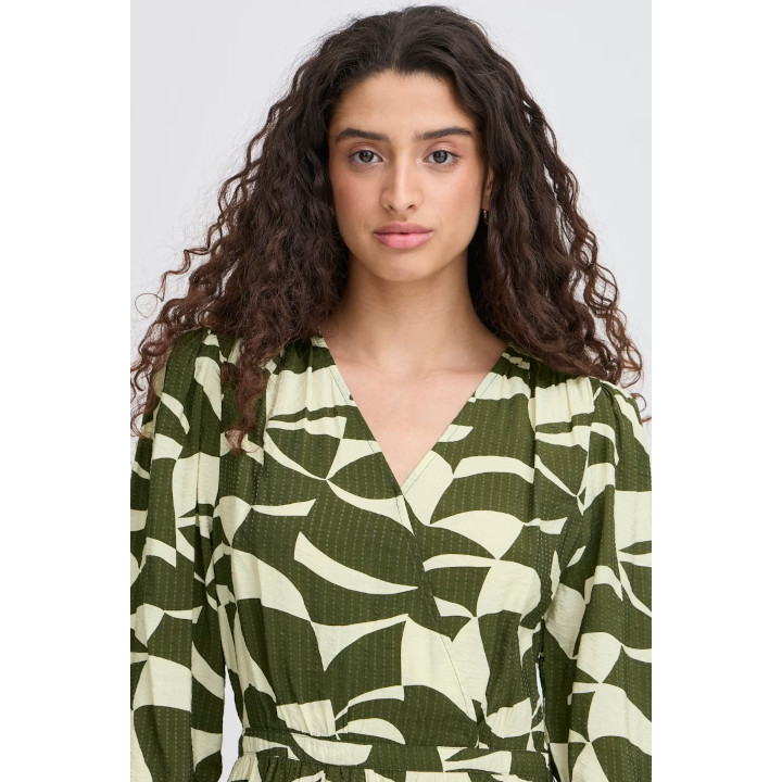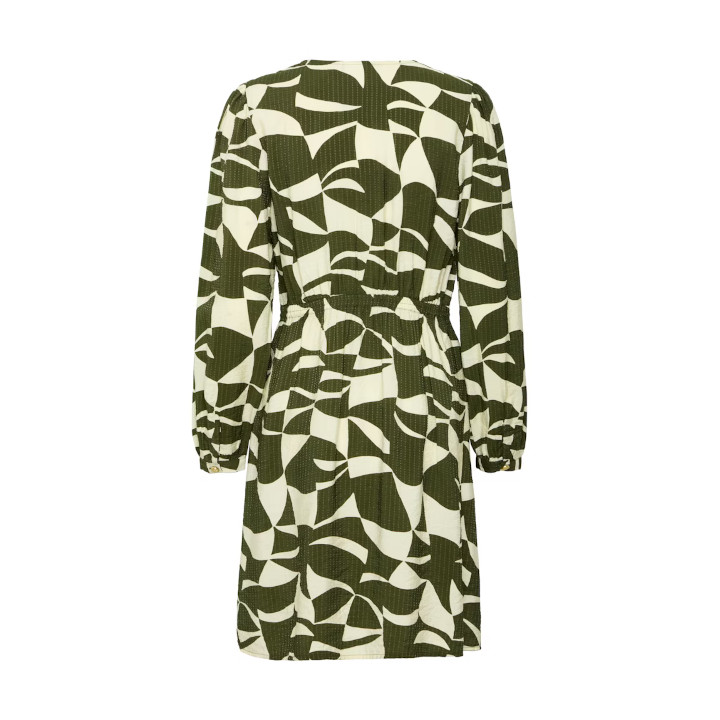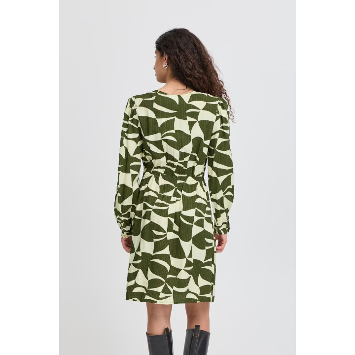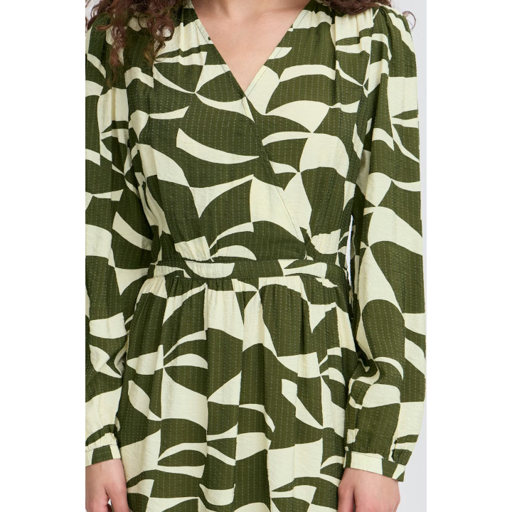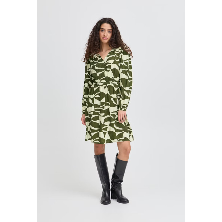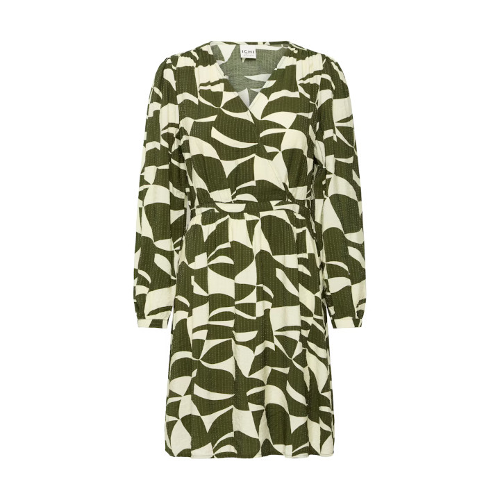 A signature style wrap dress from ICHI. This long-sleeved knee length dress features a V-neck, a graphic abstract wavy pattern in olive green and cream .
