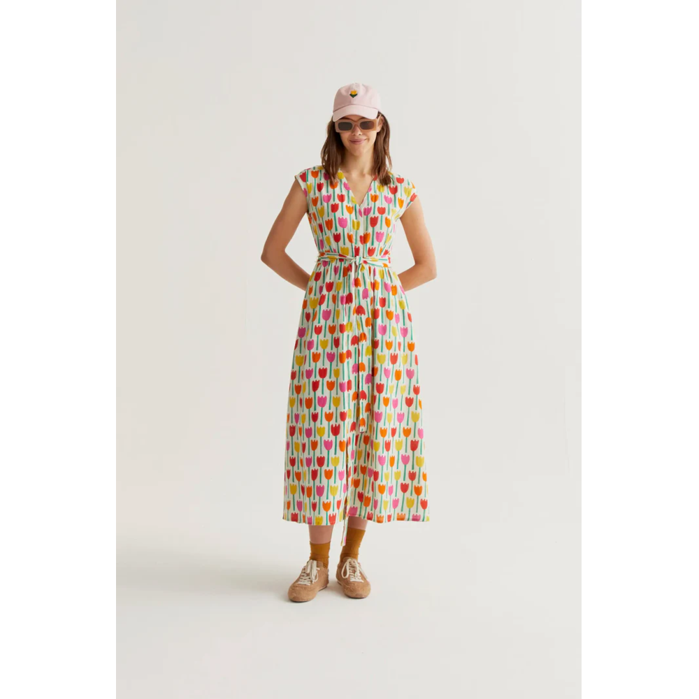 100% cotton long sleeveless dress with V neck and colourful tulip print