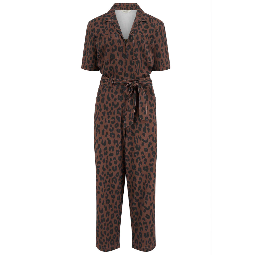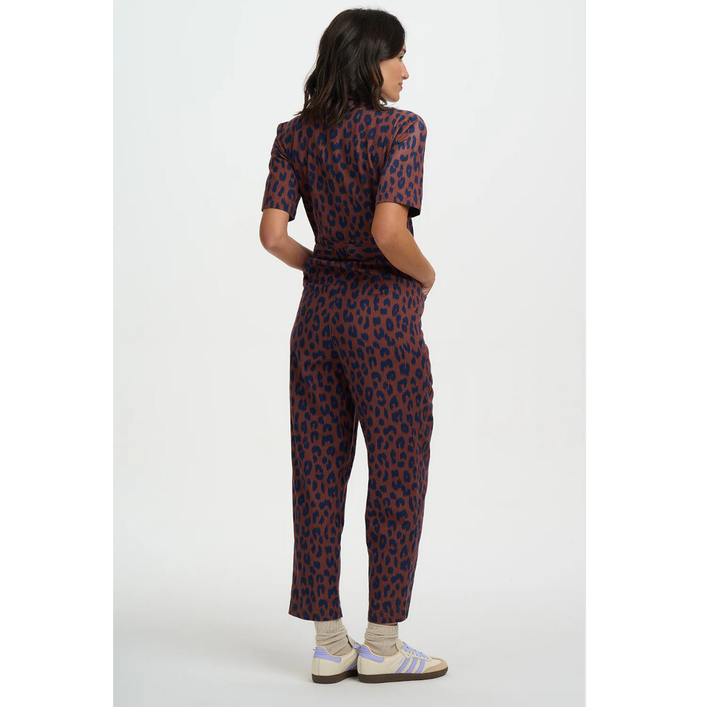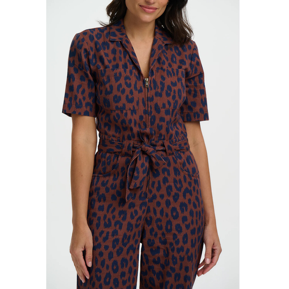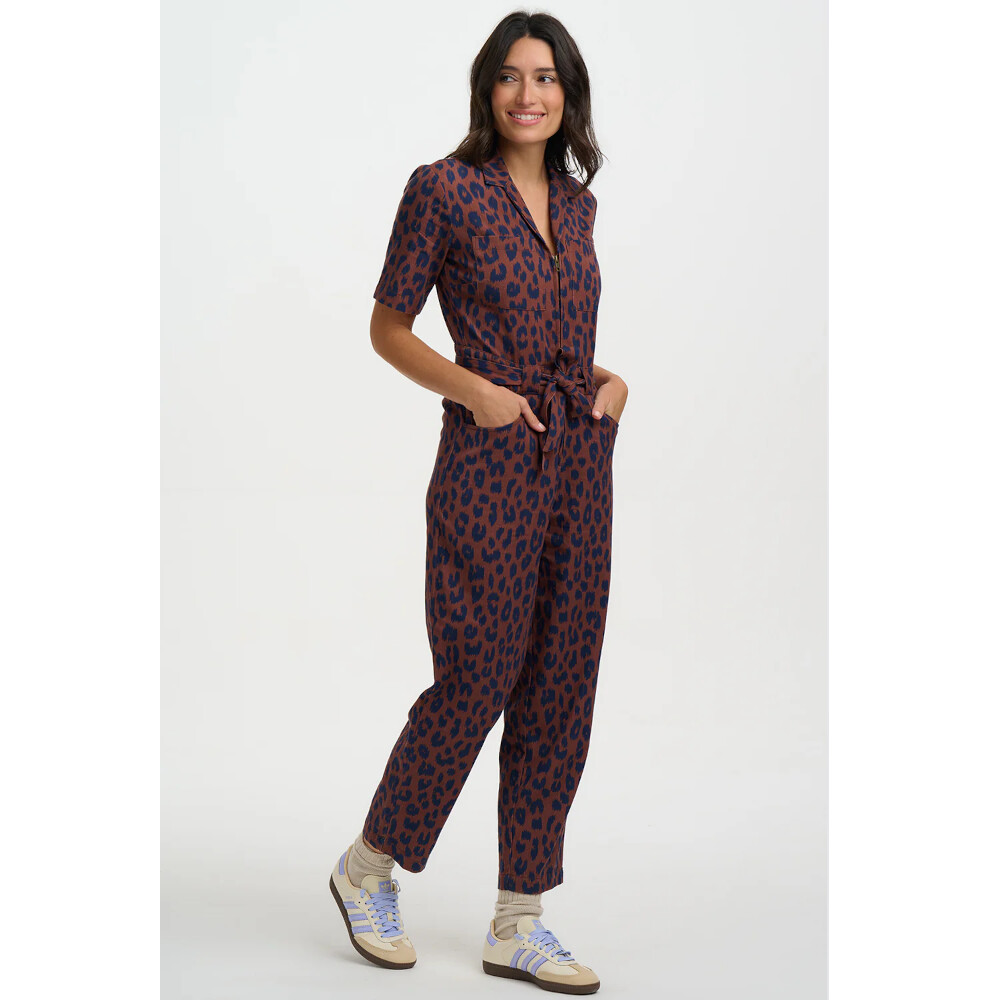 Meet the Meredith Boilersuit, your new go-to for effortless cool and everyday ease. Cut in a relaxed boilersuit silhouette, Meredith features an open shirt collar, a functional zip front opening, short sleeves, and a self-fabric belt to cinch the waist for a flattering shape. Designed in a timeless deep navy leopard spots scattered across a rich brown background, this versatile piece strikes the perfect balance between smart and casual. Whether styled with trainers for laid-back vibes or dressed up with boots, the Meredith Boilersuit is a must-have wardrobe hero.