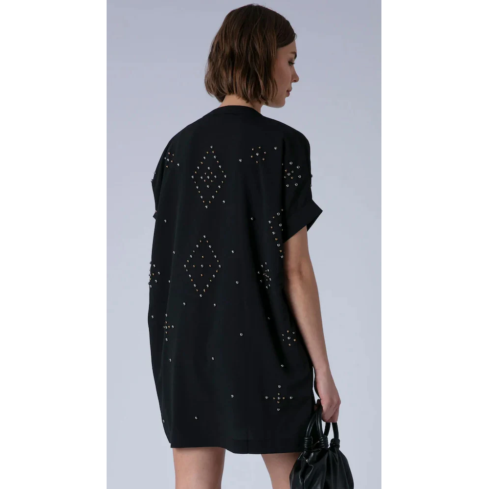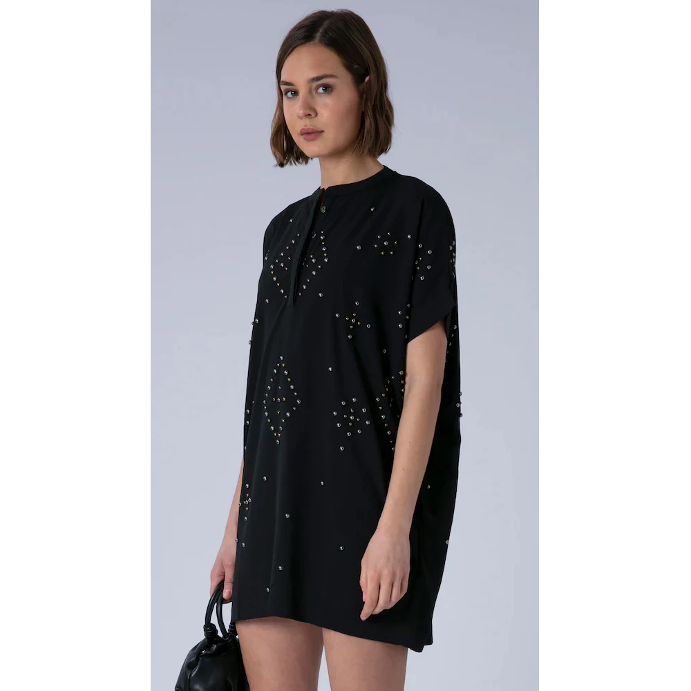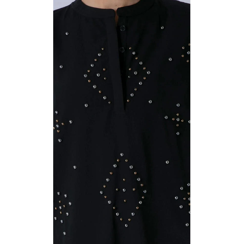 A statement take on a favourite silhouette, the Sarah Tunic is crafted in fluid black crepe and embellished with chunky all-over beading in silver and gold for a bold yet sophisticated look. Designed with a grandad collar, button-through front, and handy pockets, it offers an oversized easy fit that’s effortlessly versatile. Perfect for dressing up or down, this tunic brings elevated cool to any occasion. Go down one size if you prefer a less oversized look.