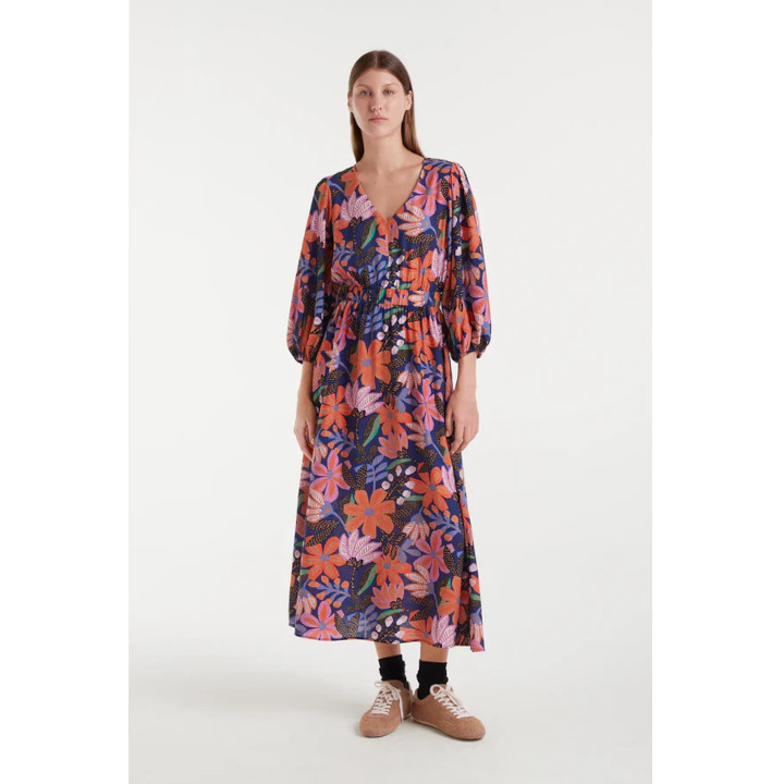 This long dress is crafted from lightweight crepe fabric and features a vibrant Tigerlily floral print. Designed with a V-neckline and three-quarter sleeves with elastic openings, it offers a relaxed yet elegant silhouette. Side pockets add a practical touch, while a delicate keyhole fastening at the back completes the look.