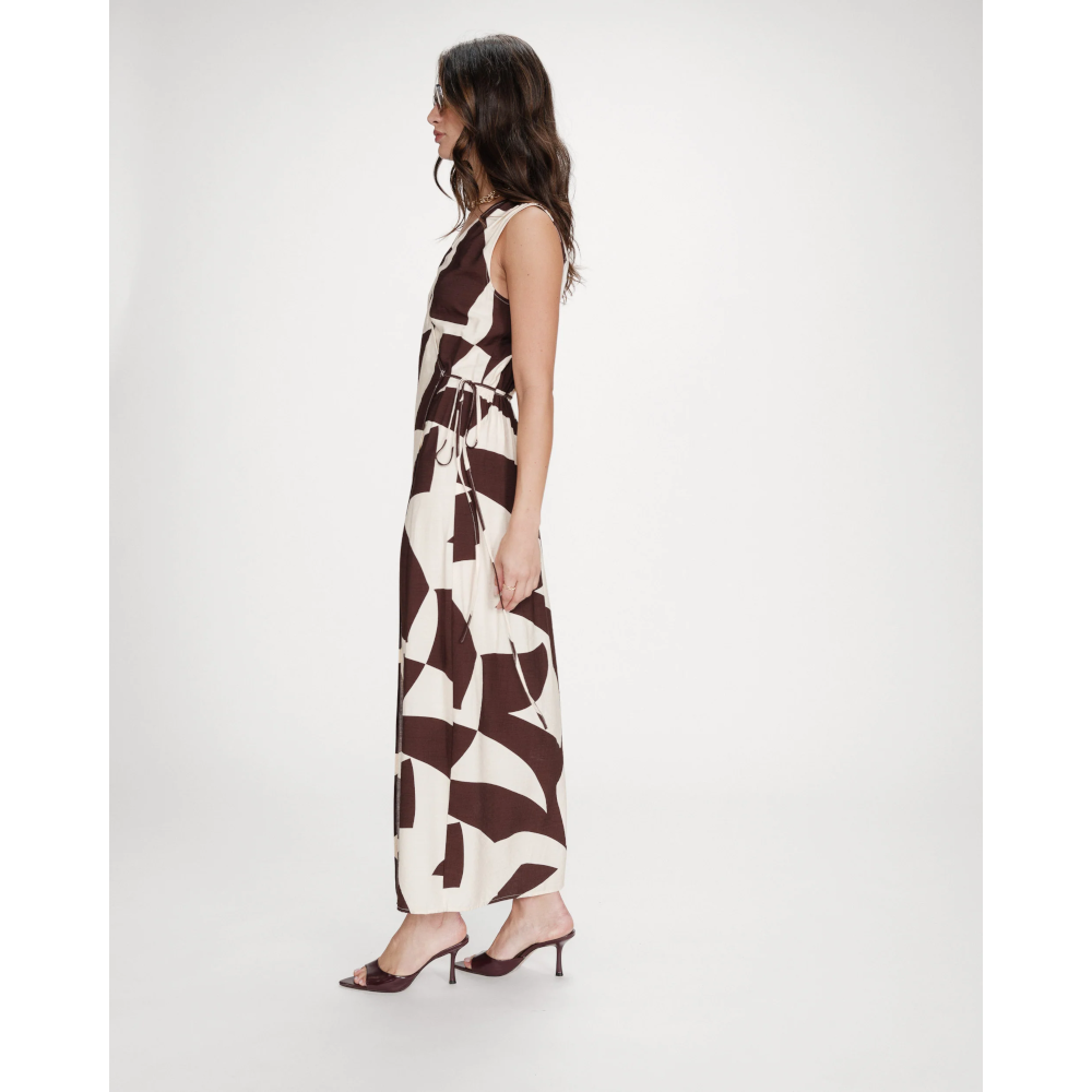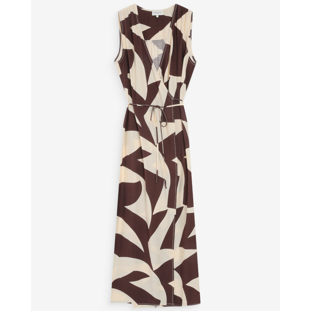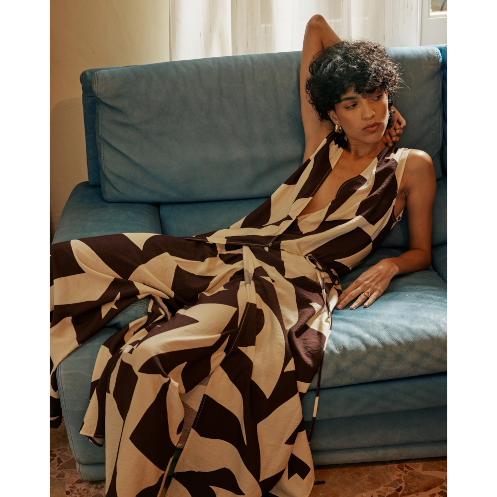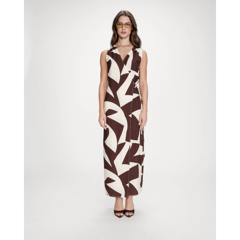 The VELLINE long dress features a wrap closure, a crossed V-neckline, and a tie-waist that create a feminine and structured silhouette. The geometric print gives a bold, graphic look. With its fluid fabric and short sleeves, the VELLINE printed dress is a must-have piece for the season.